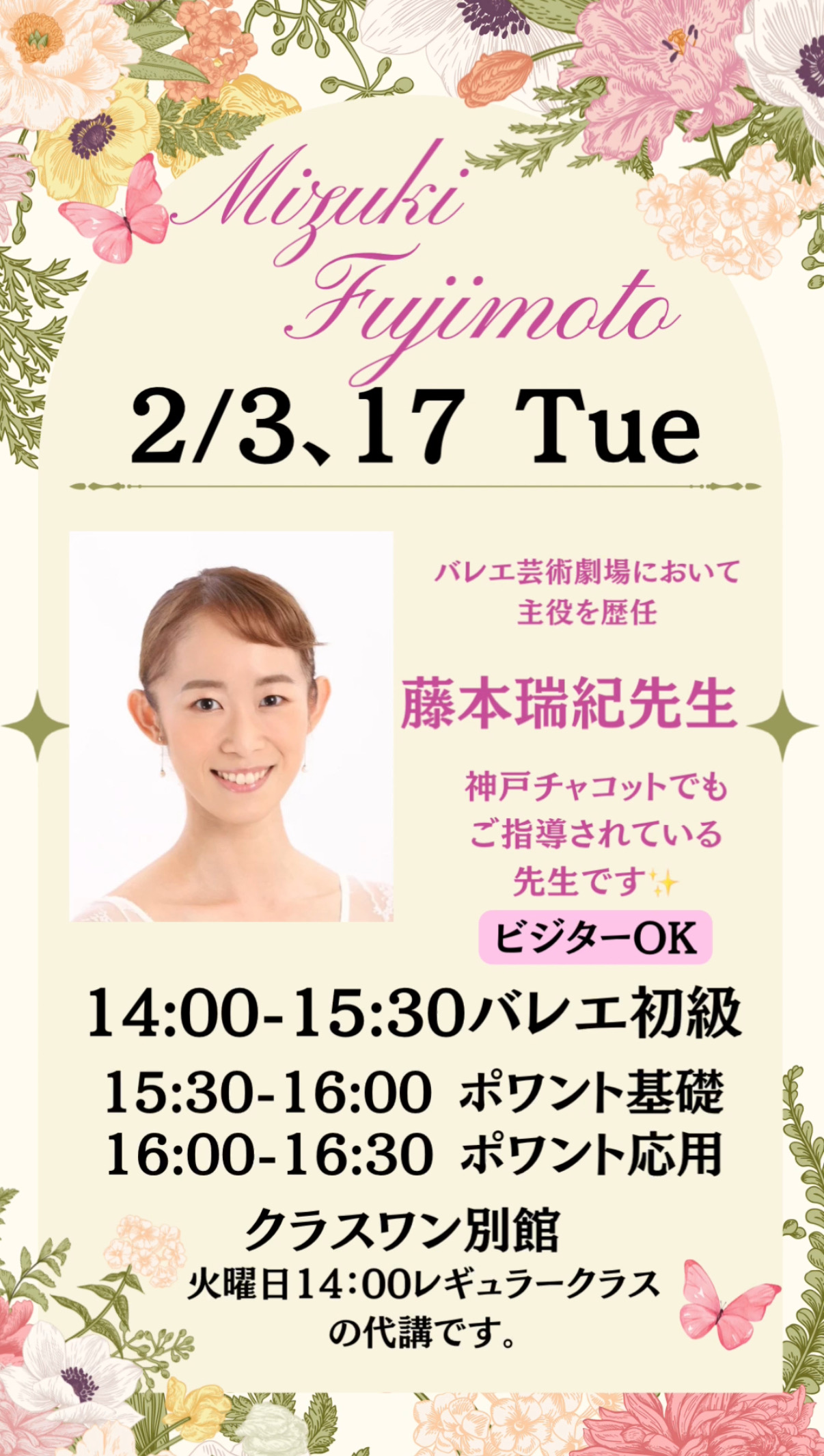 藤本瑞紀先生が第1週、第3週のご指導を担当してくださいますので、2月の月謝という形でお申し込みが可能です。