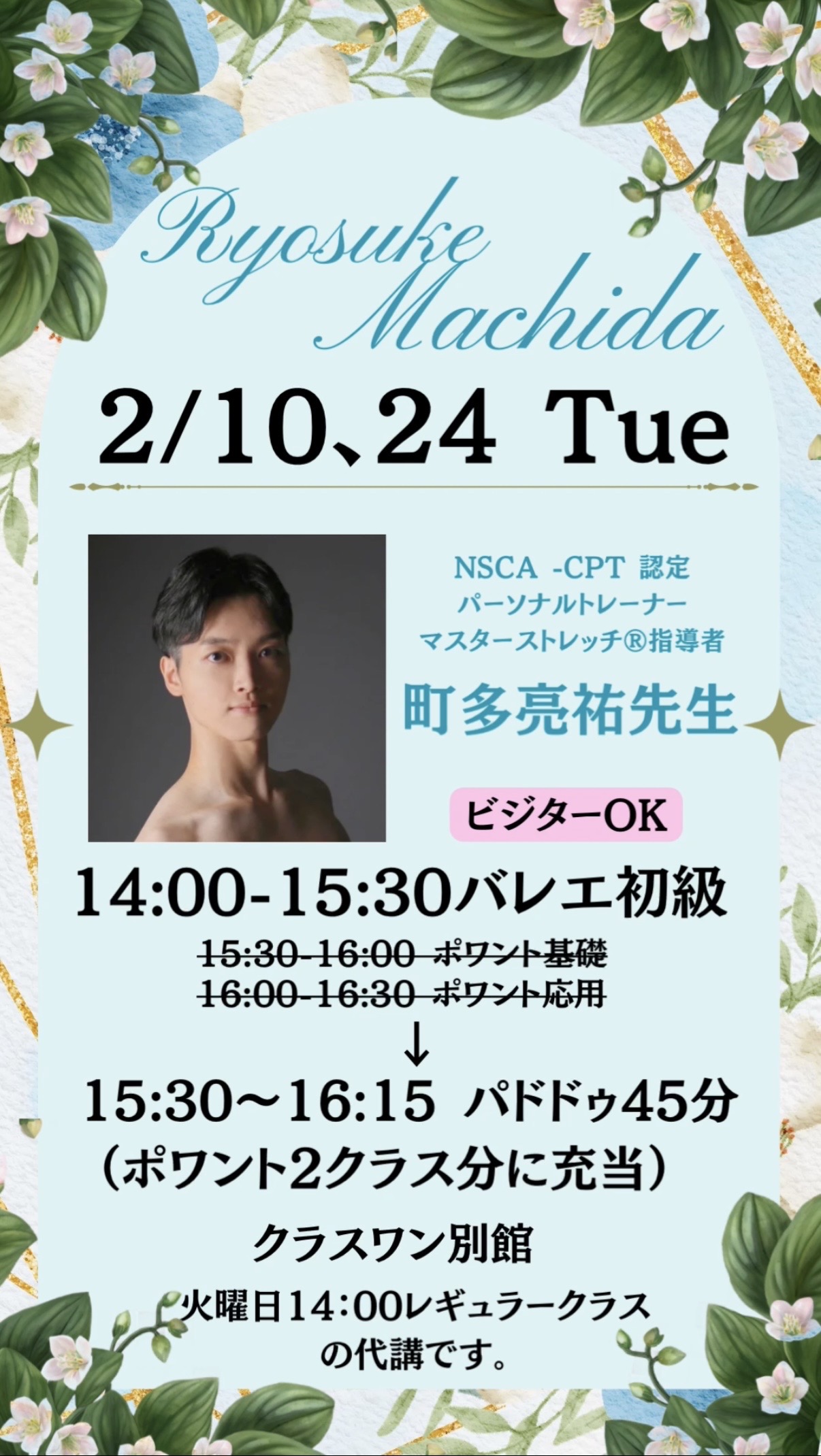 今回は特別にパドドゥクラスにてドンキホーテアダージオより抜粋した部分もご指導頂けます✨抜粋ですので振りは覚えていなくても大丈夫です❣️